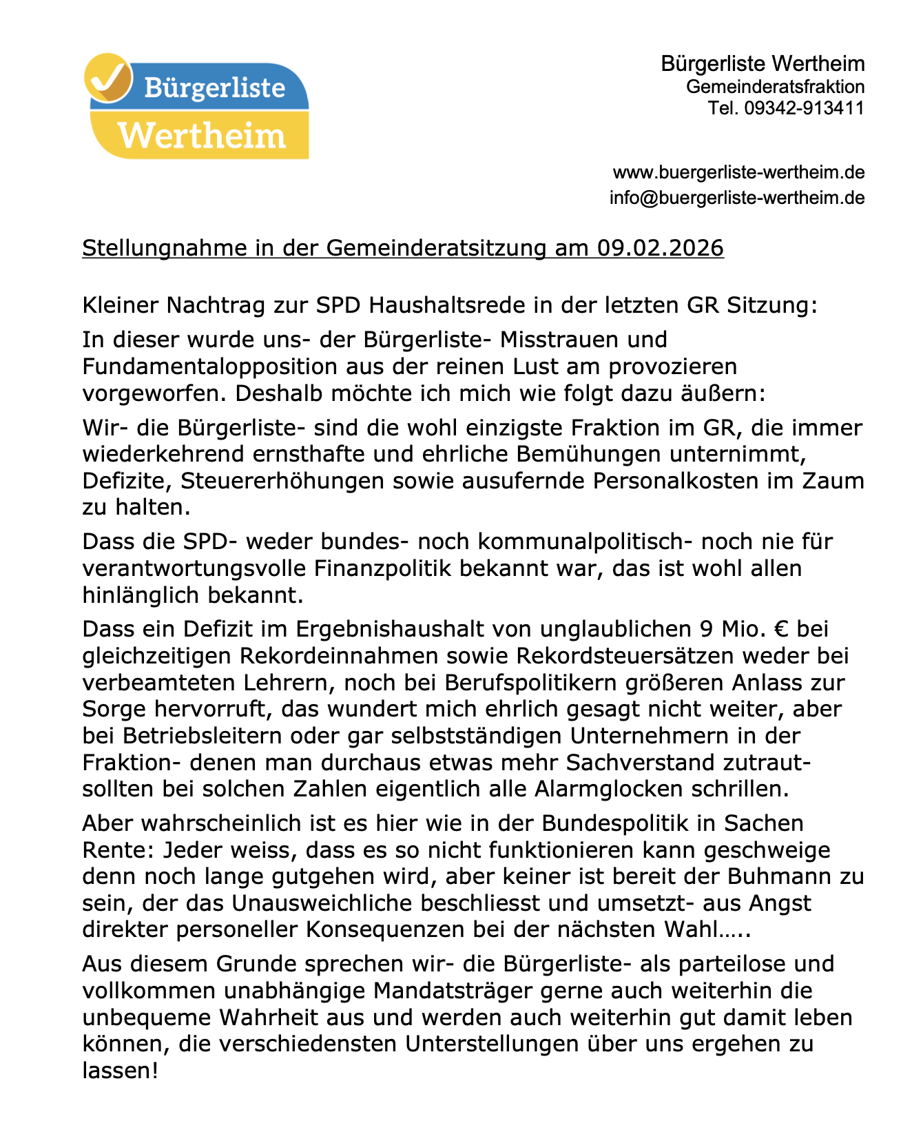 Sehr geehrter Herr Oberbürgermeister, sehr geehrte Damen und Herren der Verwaltung, liebe Kolleginnen und Kollegen, sehr geehrte Wertheimerinnen und Wertheimer, die Haushaltsberatungen sind jedes Jahr eine Herausforderung. Aber in diesem Jahr stehen wir vor besonders komplexen Rahmenbedingungen und genauso wie im vergangenen Jahr sehen wir uns auch 2026 gezwungen, klar zu sagen: Ein Ha ... [mehr lesen]